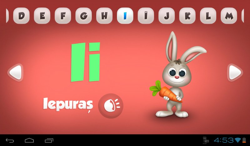 Aşa cum era de aşteptat, aplicaţia se lansează cu prima literă din alfabet – A. Pe această primă pagină, pe lângă literă mai apare imaginea unui arici şi cuvântul „Arici”; litera G, de exemplu, este reprezentată de imaginea unei Girafe. La apăsarea ei se va auzi ronţăitul ei – asta dacă nu ştiaţi cum face o girafă. Restul literelor sunt prezentate în moduri asemănătoare. Fiecare literă are un corespondent, care emite un sunet specific lui.