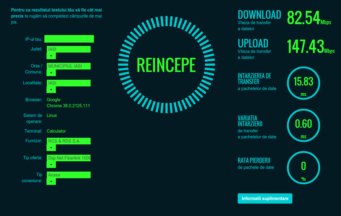 Eu am Fiberlink 1000 de la RCS & RDS, dar sistemul desktop pe care îl folosesc nu permite atingerea vitezei maxime de download oferită, adică 1000 Mbps. Aşa că, în reţeaua RDS prind cam 500-600-700 Mbps, iar în alte reţele se vede mai jos (82,54 Mbps, adică 10,3 MB/sec, ceea ce nu e rău, în condiţiile în care aveam deschisă şi interfaţa Google Play Music unde încărcam jdemii de melodii în cont 🙂 ):