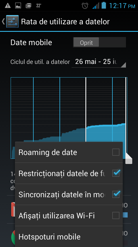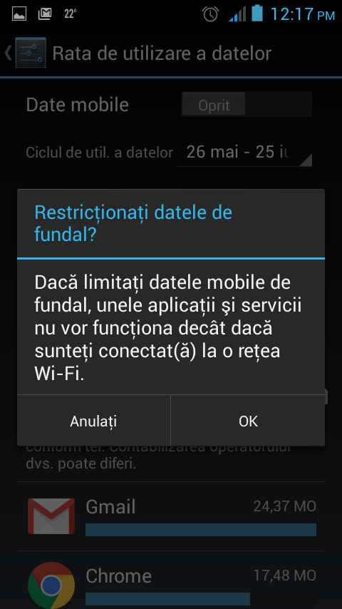 Pentru a ajunge la această opţiune, se navigă la Setări >> Rata de utilizare a datelor >> Restricţionare date de fundal (se apasă pe butonul de Meniu).