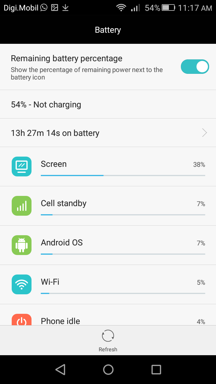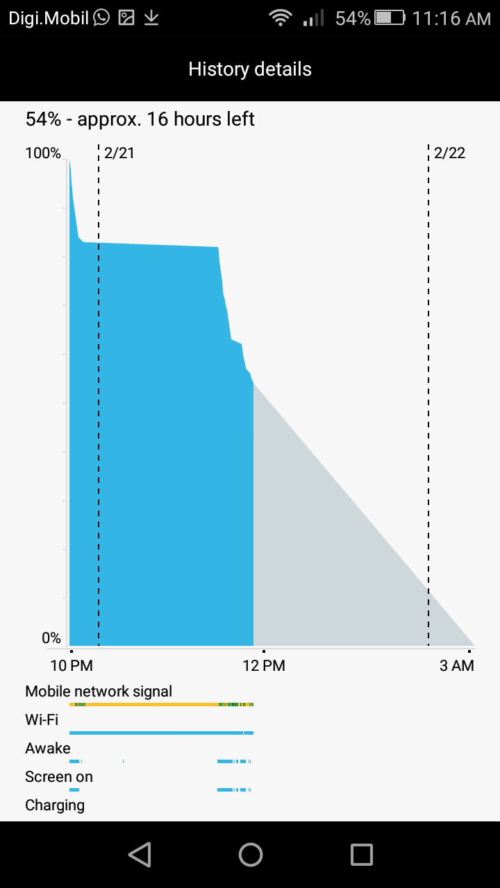 După cum se observă și în imaginile de mai sus, un nivel de încărcare de 54% a bateriei telefonului Huawei Y6 mai asigură încă 13 ore și 27 de minute de funcționare. Nu-i rău.