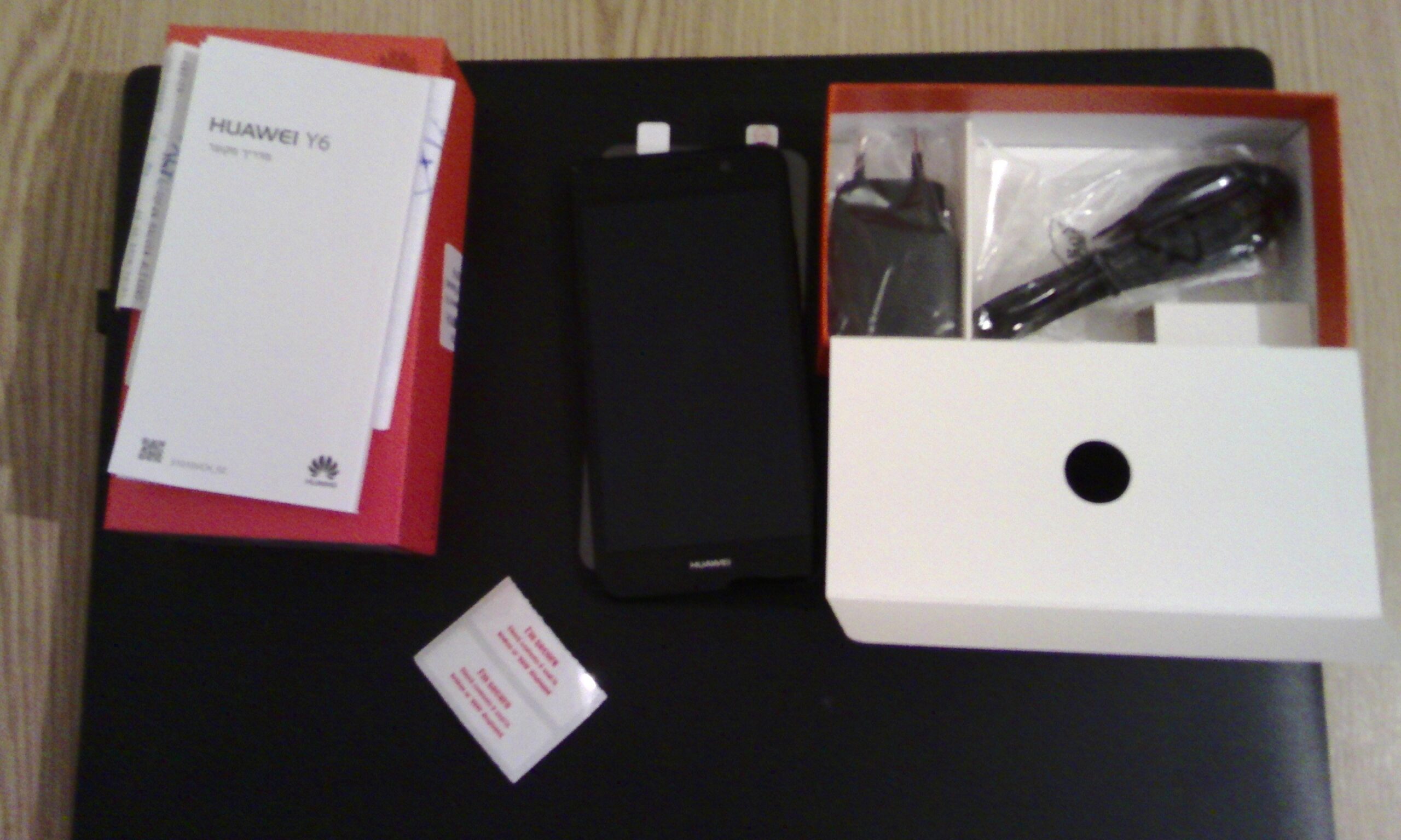 Huawei Y6 sosește într-o cutie roșie, obișnuită, care nu atrage atenția prin nimic. Telefonul vine împreună cu un încărcător 5V/1A, un cablu de încărcare/de date USB - microUSB de 1m, o folie de protecție și de un ghid (care conține și limba română) de punere în funcțiune și recomandări de întreținere.